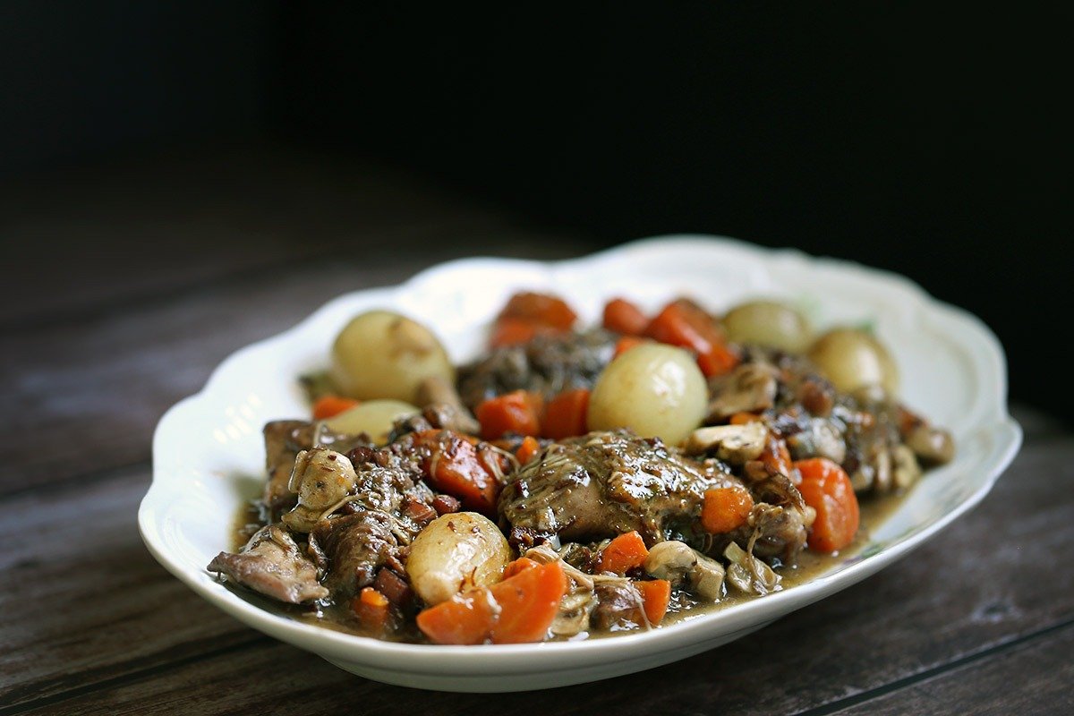 Inspirada na receita dela, mas adaptando ao nosso gosto brasileiro, fiz o Coq au Vin (Galo ao Vinho). Só que, em vez de galo, este é feito com galinha. Apesar do nome complicado (se pronuncia “Coque o vã”), é uma receita simples, com ingredientes fáceis de encontrar, porém possui algumas etapas a serem seguidas.