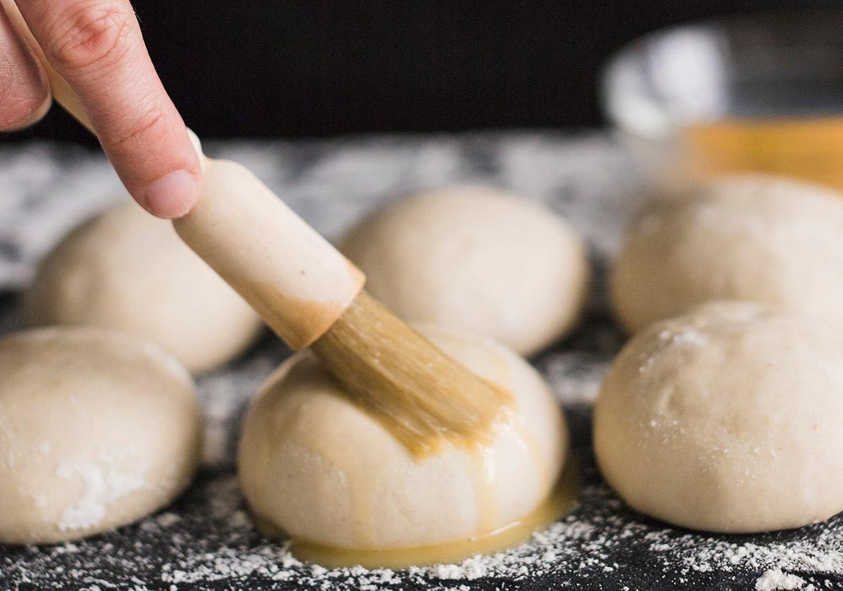 Misturar todos os ingredientes e por último a farinha de trigo para dar o ponto. O mais importante é sovar (amassar) muito. Colocar em formas de pão, untada com óleo, para crescer. Quando estiver bem crescido colocar por cima uma gema, misturada com uma colher de leite e botar para assar.