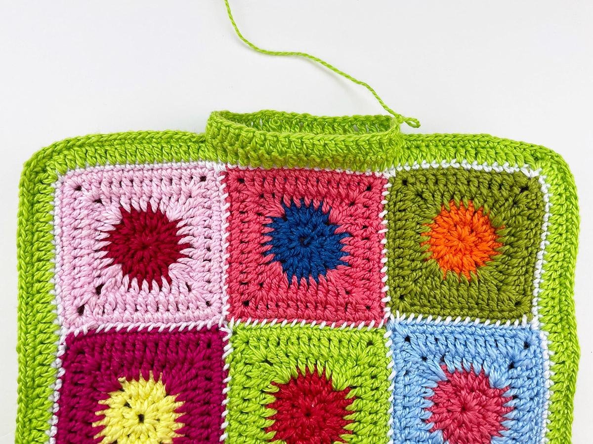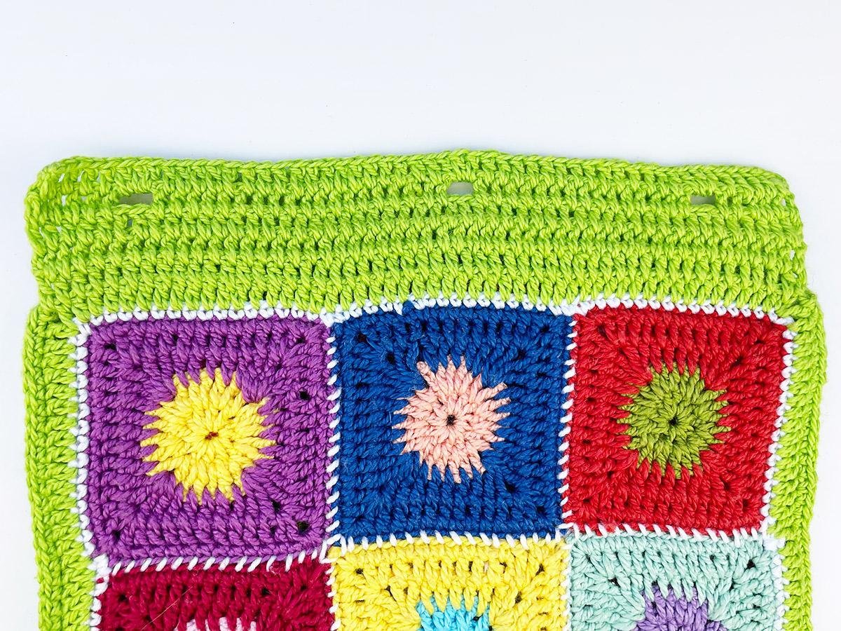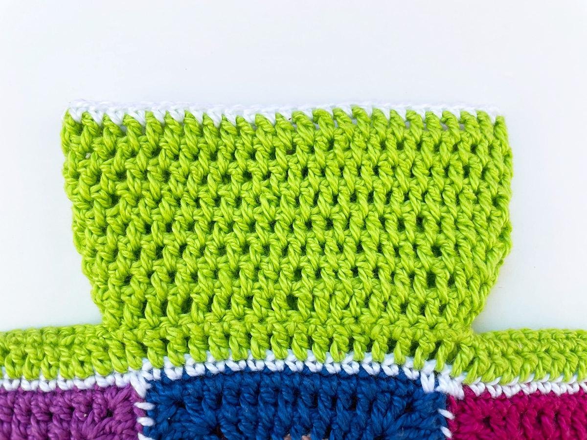 Com um pedacinho de linha, faça uns nós para alinhar os quadrados de cima com o debaixo. E, conforme o arremate vai passando, tire os nós.