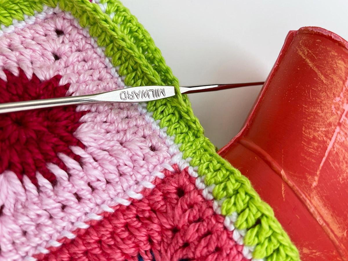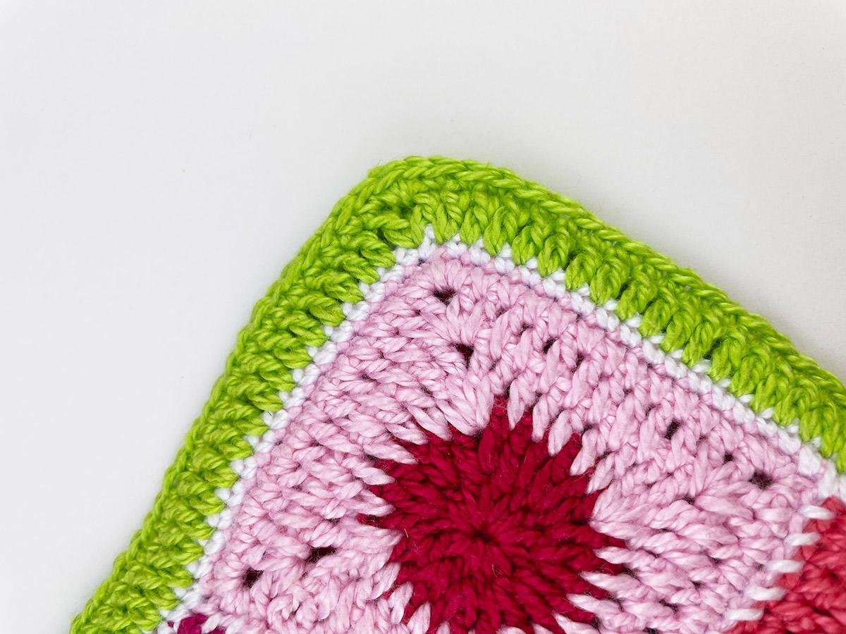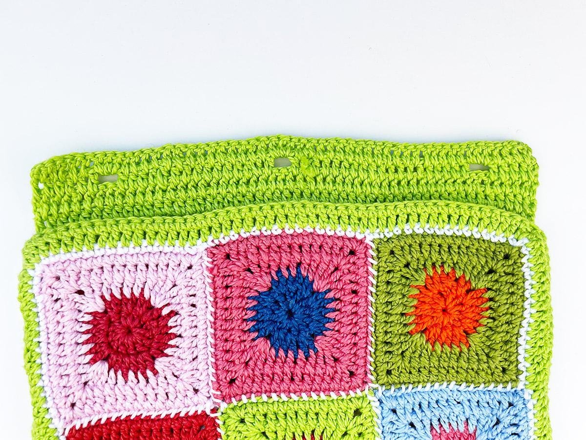 Com um pedacinho de linha, faça uns nós para alinhar os quadrados de cima com o debaixo. E, conforme o arremate vai passando, tire os nós.