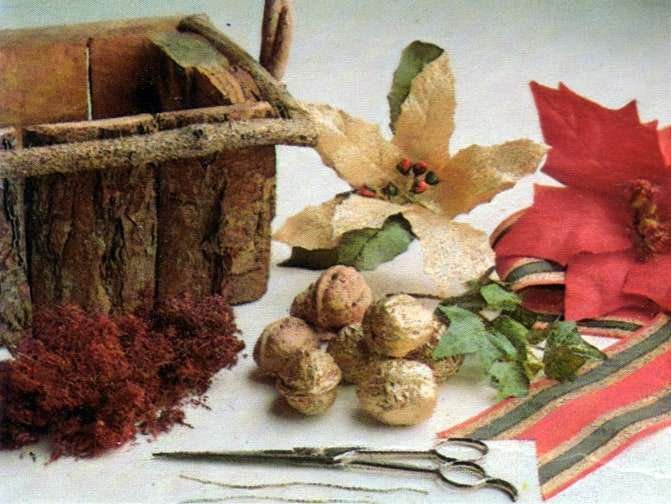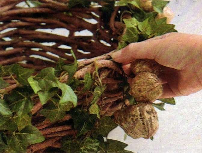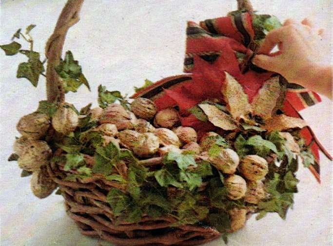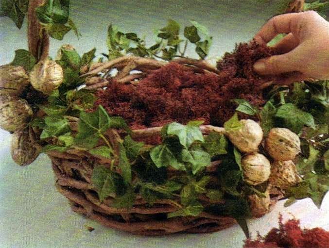 - Materiais: Cestas de cipó ou cachepô de tronquinho; nozes, folhas de hera e bicos-de-papagaio artificiais, musgo colorido, espuma-floral; arame fino, fita larga, tinta spray dourada e cola quente. Pinte as nozes com a tinta spray.