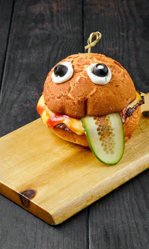 Prepare pequenos hambúrgueres com carne moída (patinho), temperando apenas com sal. Congele em um pote, separando cada unidade com um plástico para não grudarem. No dia de montar a lancheira, retire a quantidade que a criança costuma comer, asse na air fryer ou no forno convencional e monte com minipão de hambúrguer e queijo. Decore para os hamburguês ficarem divertidos. Para não desmontar na lancheira, vale prender com garfinhos infantis.