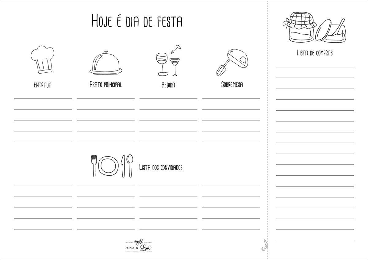 Na parte superior do planner, você irá colocar a entrada, o prato principal, as bebidas que irá servir e a sobremesa (me convida para esse último item). Na parte debaixo, a lista de convidados; e, à direita, a lista de compras, a qual você poderá cortar e levar para o supermercado.