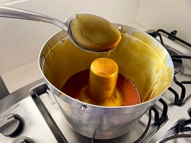 - Segure a forma com um pano de prato e gire-a, caramelizando também as laterais.
